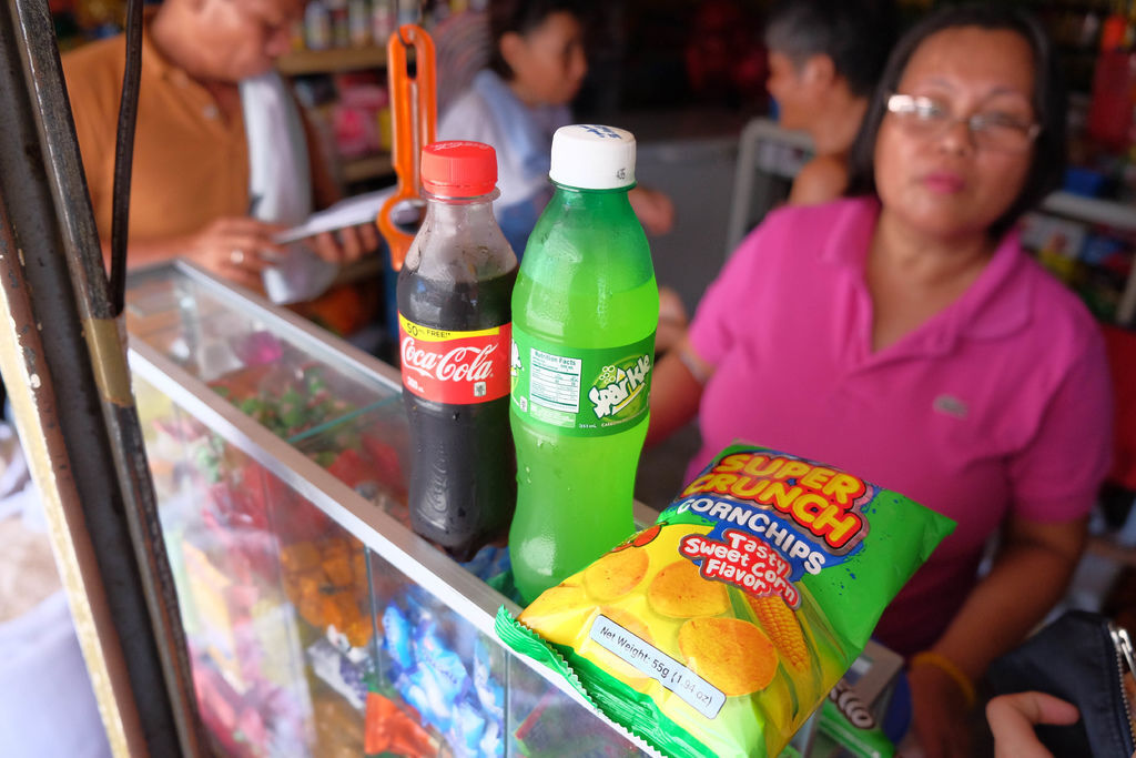 一罐可樂、雪碧加包玉米脆片,加起來大約55披索,換成台幣不到40元