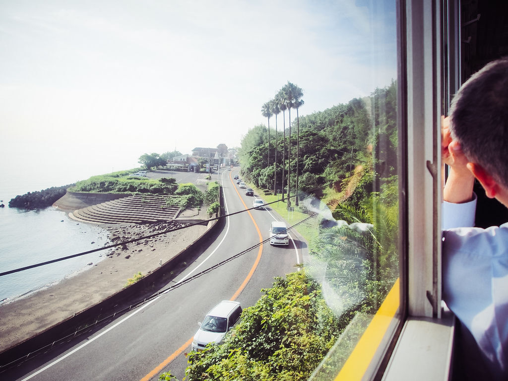 JR油菜花號,緩緩前往指宿地區,早上陽光灑了進來靠在窗邊記錄了一下沿海的窗外風景