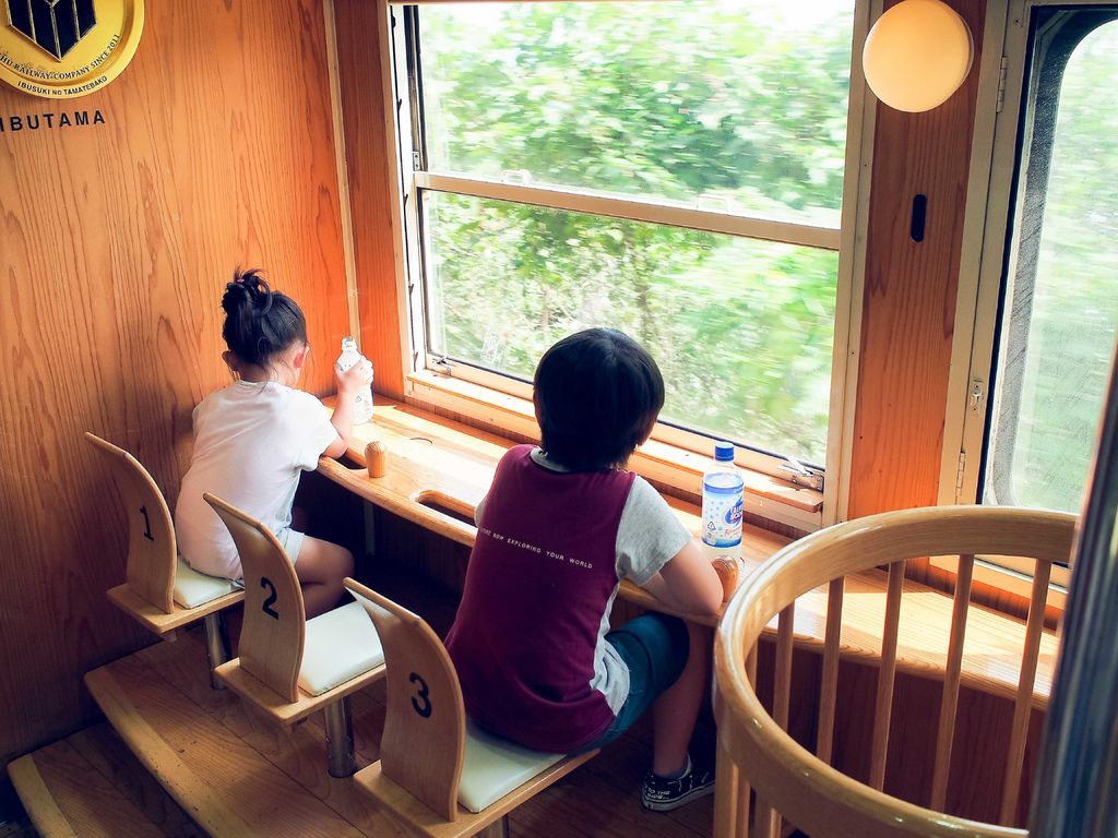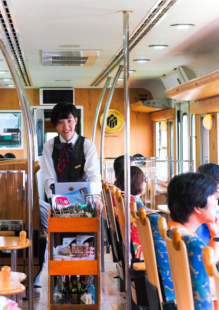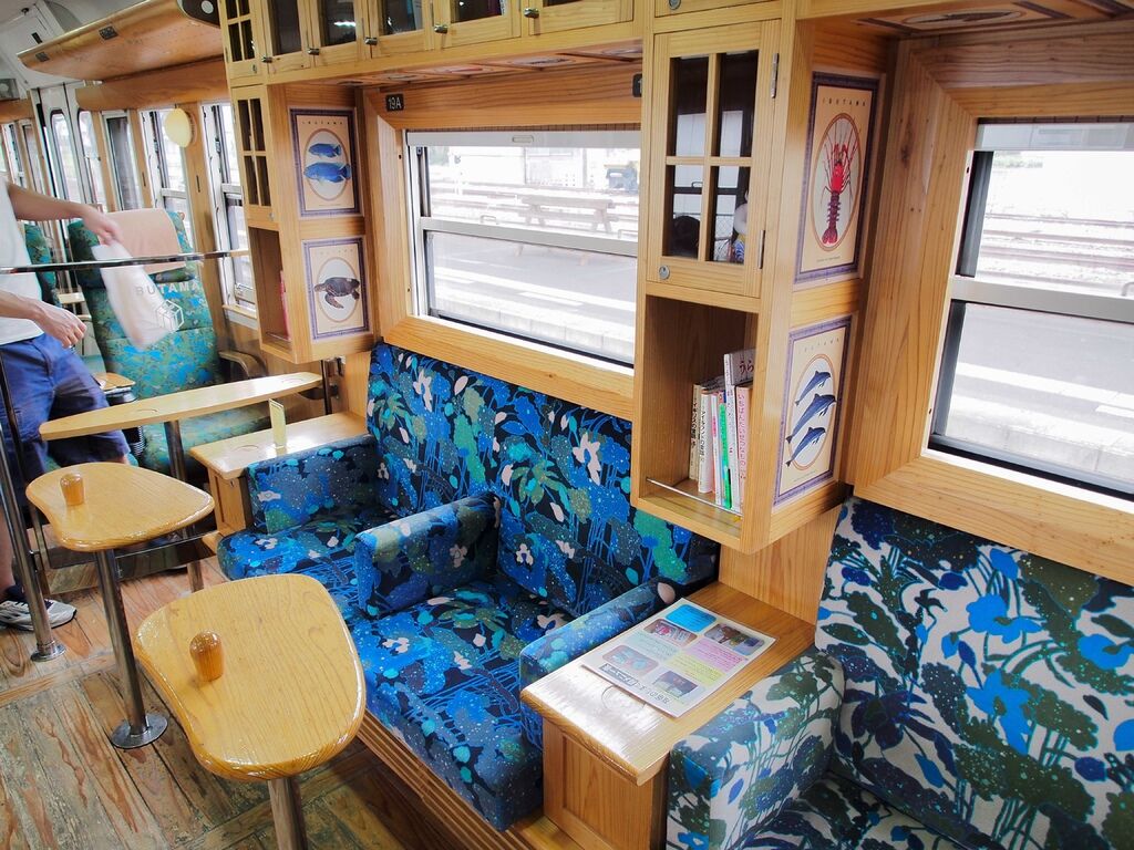 黑白設計感的列車,黑色面是觀賞山景,白色面是觀賞海景,幸運的旅客可以悠閒的欣賞薩摩半島的美麗景色