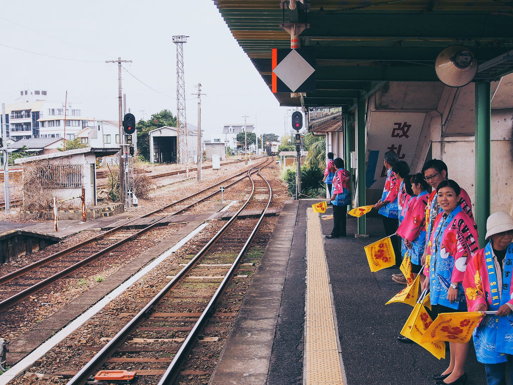 車站人員都大陣仗的列隊歡迎,手拿旗子好像在迎接什麼大人物一樣