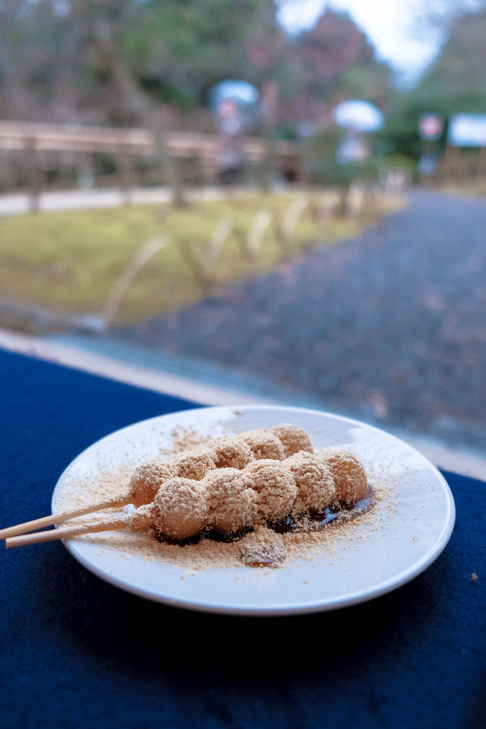 下雨了,趕緊躲進茶屋裡,來參觀梅園時給了我們一張兌換卷,在茶屋下吃著黃豆粉麻糬然後賞梅花,很剛好的愜意。