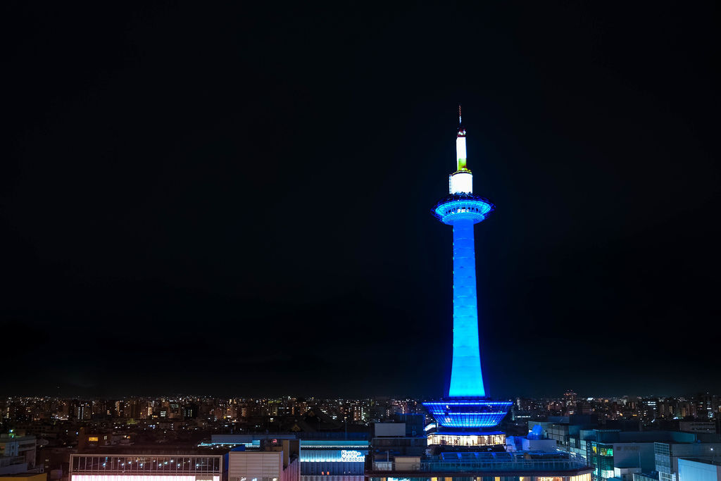 空中小徑眺望京都塔,可能是早上下過雨吧,讓京都在夜晚時變得乾淨清澈,打在京都塔上的燈光也隨著時間不同有著多種變化,而今晚一樣是種藍調的魔力。